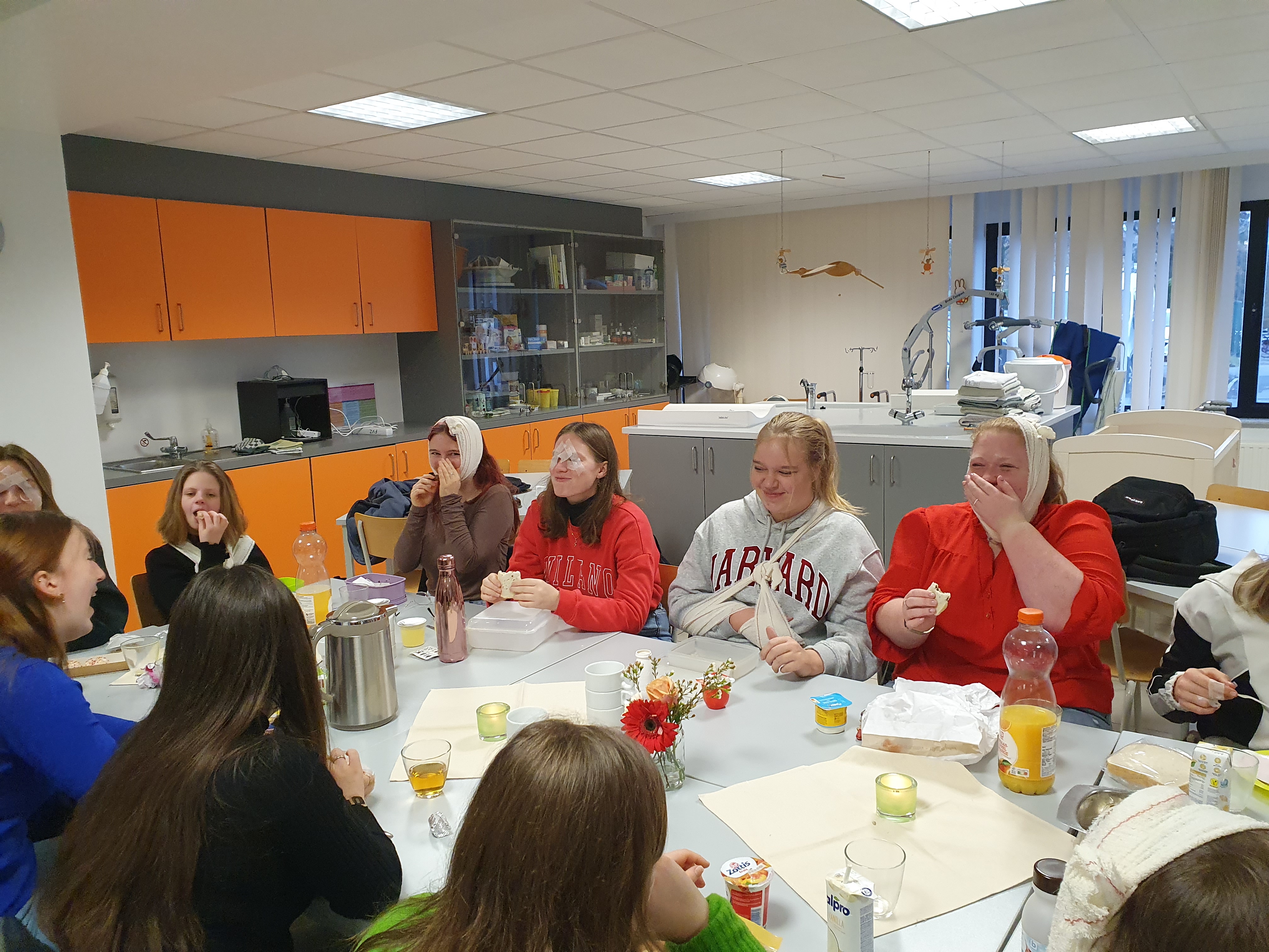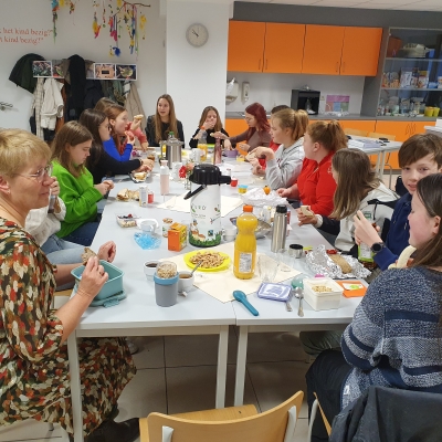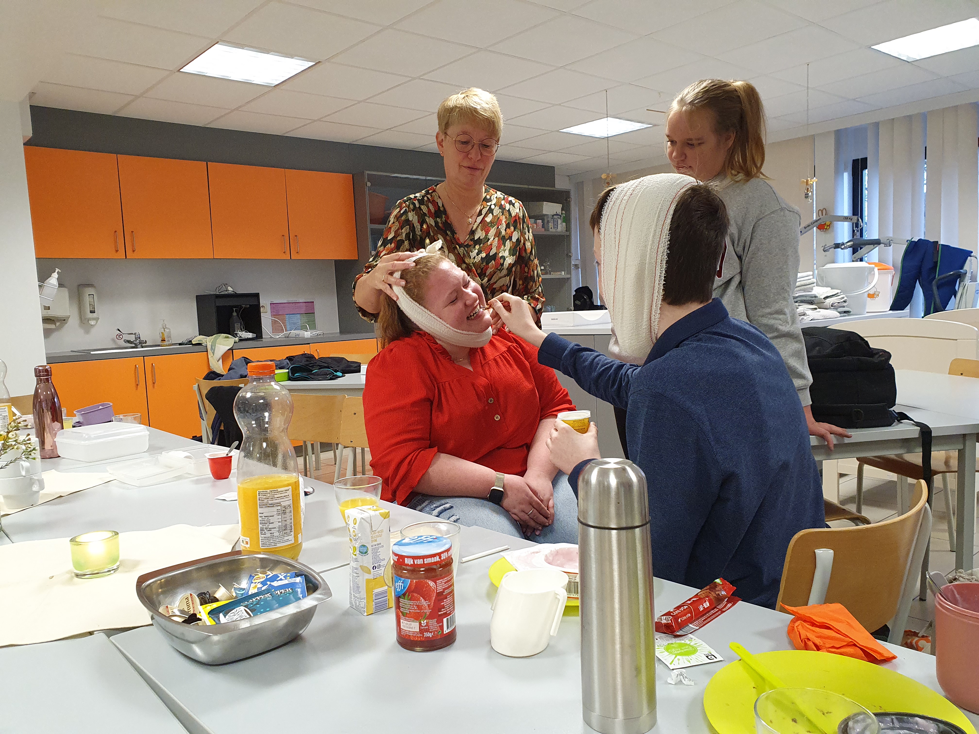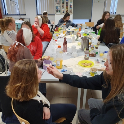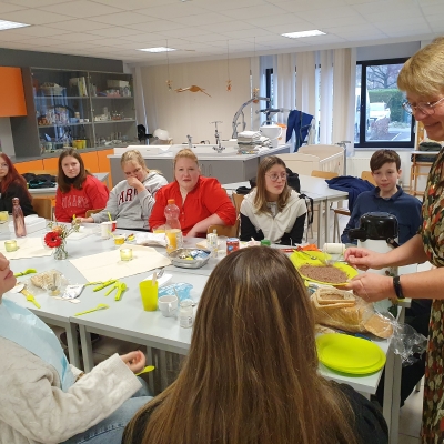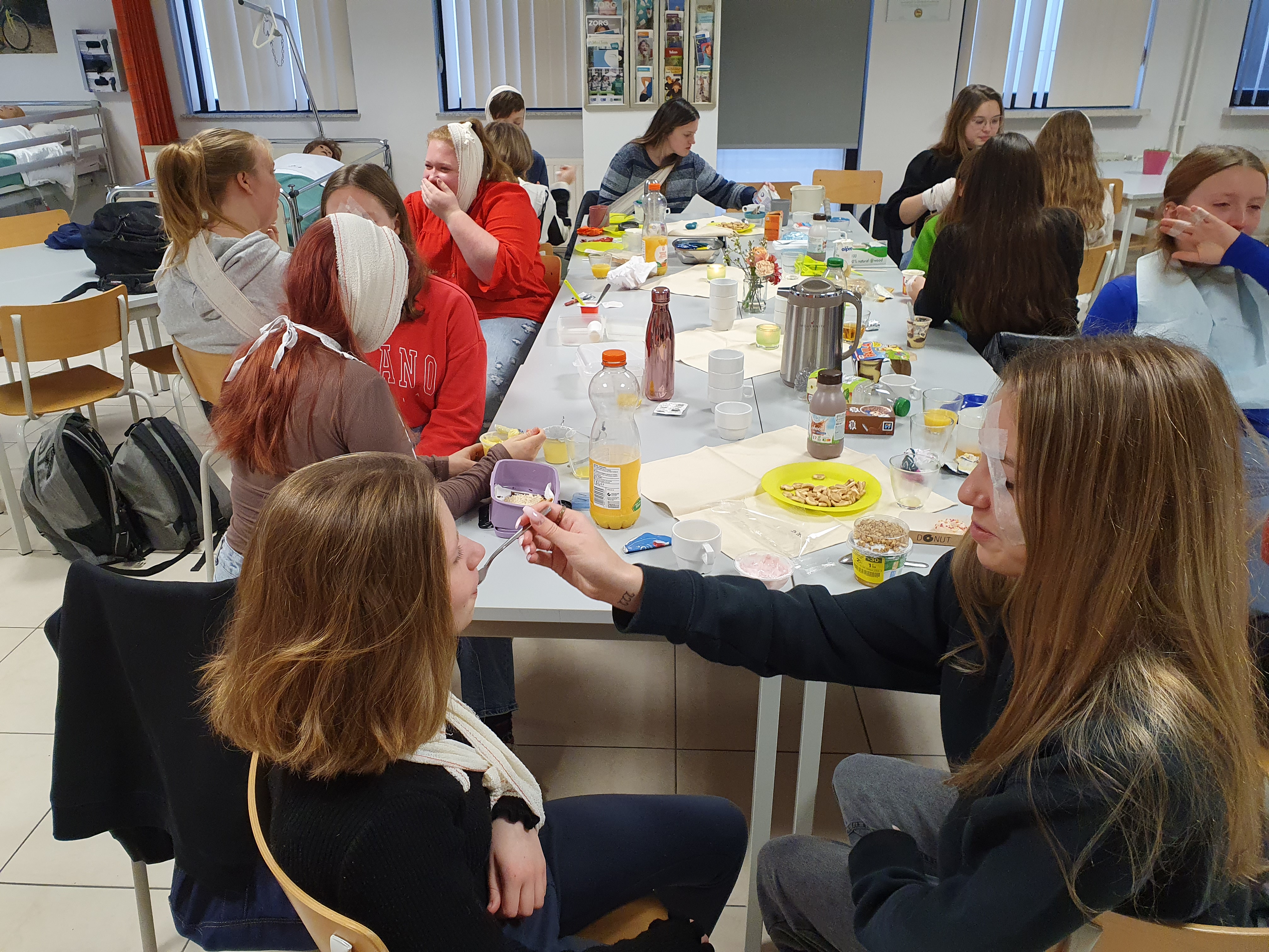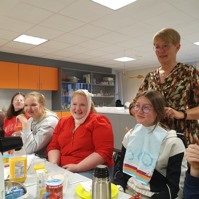 Wat is beter om iets te leren dat het zelf te ervaren? Met die gedachte hadden de leerlingen van het 5de jaar Gezondheidszorg een speciaal ontbijt op de planning staan. Mevrouw Lefere gaf vanuit de lessen Zorg heel praktisch les over maaltijdbegeleiding, de mogelijke hulpmiddelen en nog heel wat tips en tricks. Iedereen kreeg een beperking aangemeten en kon zo ervaren hoe het voelt voor een cliënt. De ene had slikproblemen, terwijl een ander last had van kauwproblemen, artrose had of slechtziend was. Mevrouw De Pourcq koppelde aan deze les ook het agogische aspect en het inzetten op de professionele zorgrelatie. Onze toekomstige zorgkundigen leerden vandaag weer heel wat bij en iedereen zag dat het goed was!